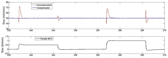 動(dòng)態(tài)壓力補(bǔ)償是對(duì)快速壓力變化的補(bǔ)償。當(dāng)同一供應(yīng)管線上的較大流量質(zhì)量流量控制器更改設(shè)定值時(shí),就可能發(fā)生這種情況,該不良影響也稱為“串?dāng)_”。當(dāng)壓力傳感器識(shí)別到這些快速的壓力變化時(shí),將相應(yīng)地調(diào)整閥門控制,以保持流量穩(wěn)定。 |