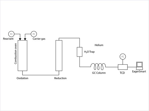 | 第二個(gè)質(zhì)量流量控制器將氦氣引入燃燒爐,作為燃燒氣體的載體。水(H2O)在燃燒爐下游的脫水器中被去除,氦氣載入燃燒氣體道氣相色譜(GC)柱分離組分。氣體隨后傳送到熱導(dǎo)檢測(cè)器(TCD)來定量地確定各種氣體的數(shù)量,以及相應(yīng)元素的數(shù)量。第三個(gè)質(zhì)量流量控制器向熱導(dǎo)檢測(cè)器提供氦氣流量。